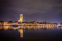 Nachtelijk uitzicht op de stad Deventer gelegen aan de oevers van de rivier de IJssel in Overijssel, Nederland in de donkere decemberdagen voor Kerstmis. De toren van de St. Lebuinuskerk of Grote Kerk is een herkenningspunt in het centrum van de stad.