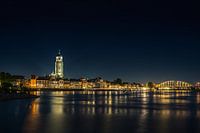 De majestueuze Lebuinustoren, badend in zacht licht, vormt het trotse middelpunt van de stad. Rechts in beeld gloeit de iconische Wilhelminabrug, waarvan de verlichting als een gouden lint over de rivier lijkt te liggen. Hoog boven dit alles schitteren talloze sterren, die samen met de warme gloed van de stad een prachtig contrast vormen.