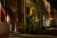 Deventer winteravond straatbeeld met kerstversieringen in de oude stad die beroemd is om het jaarlijkse Dickens festival in de dagen voor Kerstmis.
