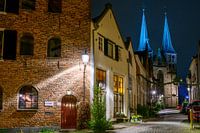 Deventer winteravond straatbeeld in het Bergkwartier met kerstversieringen in de oude stad die bekend staat om het jaarlijkse Dickens festival in de dagen voor Kerstmis. De twee torens van de Bergkerk staan hoog aan het einde van de straat.