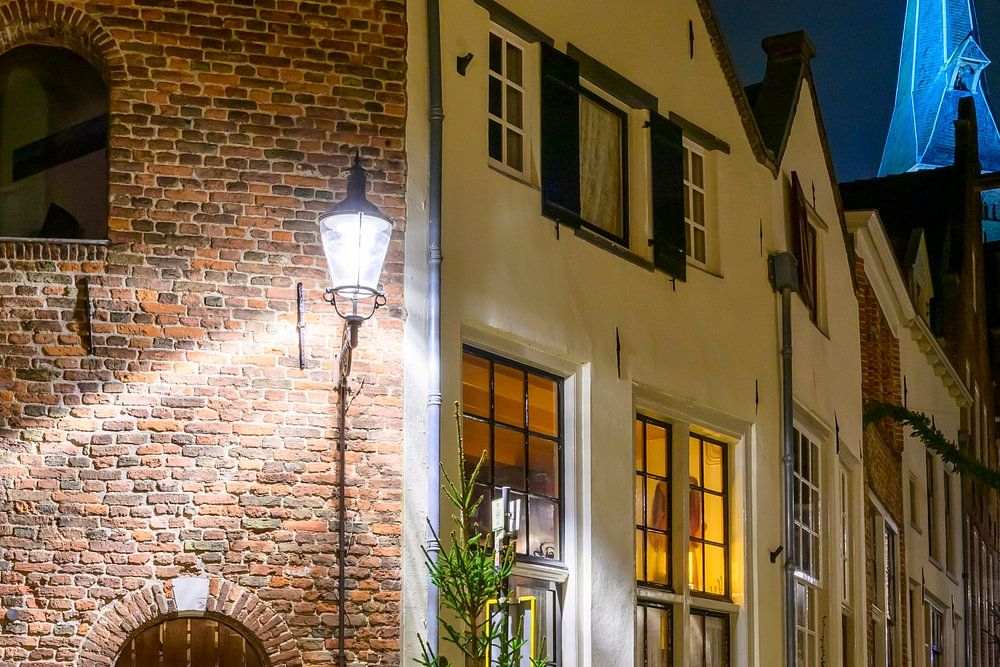 Deventer winteravond straatbeeld in het Bergkwartier met kerstversieringen in de oude stad die bekend staat om het jaarlijkse Dickens festival in de dagen voor Kerstmis. De twee torens van de Bergkerk staan hoog aan het einde van de straat.