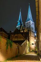 Deventer winteravond straatbeeld in het Bergkwartier met kerstversieringen in de oude stad die bekend staat om het jaarlijkse Dickens festival in de dagen voor Kerstmis. De twee torens van de Bergkerk staan hoog aan het einde van de straat.