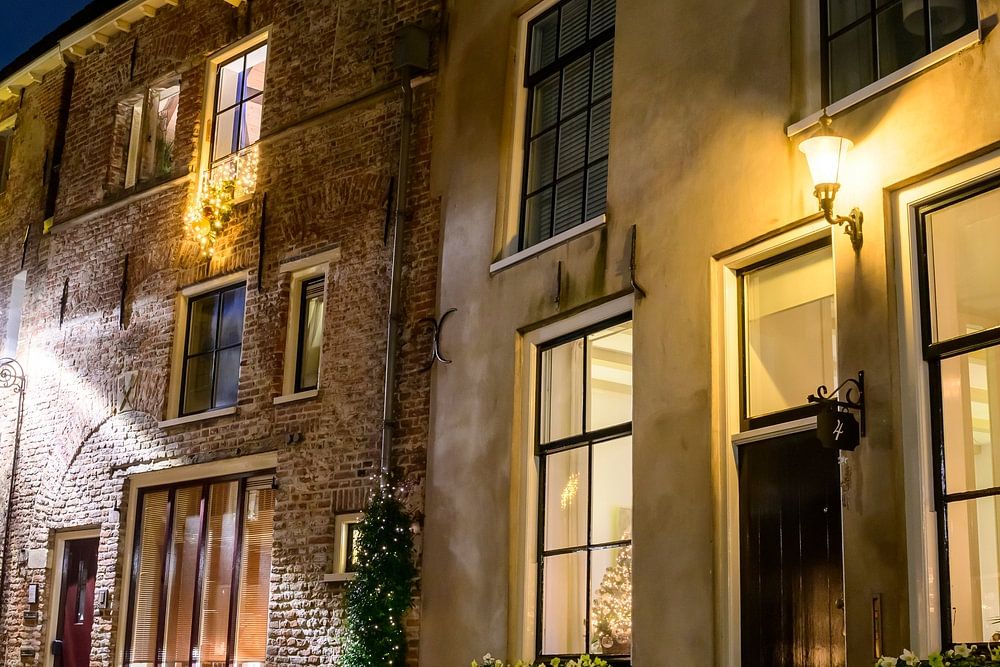 Deventer winteravond straatbeeld met kerstversieringen in de oude stad die beroemd is om het jaarlijkse Dickens festival in de dagen voor Kerstmis.