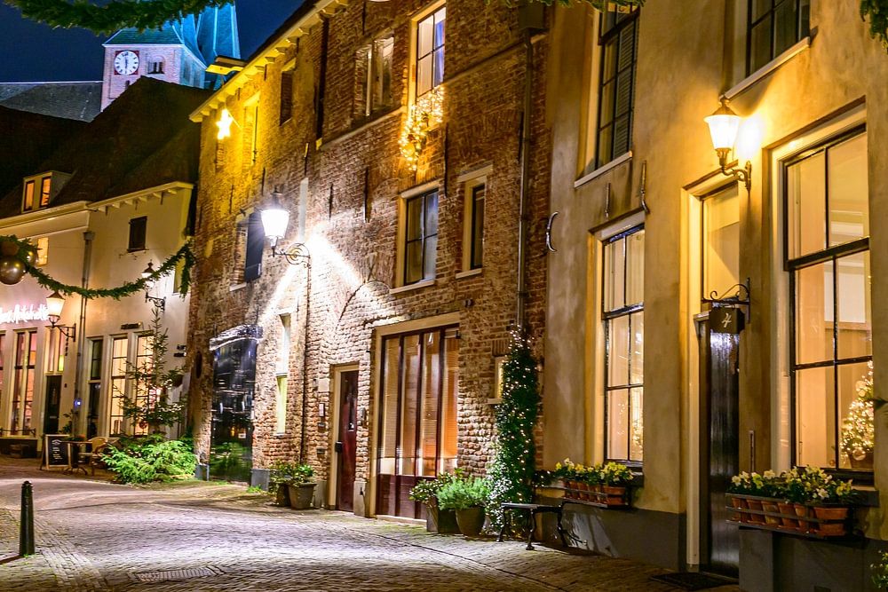 Over "Deventer winteravond straatbeeld met kerstversiering"