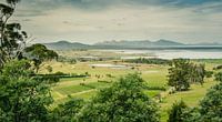 Op de achtergrond zie je Coles Bay, bij het Freycinet NP. Deze prachtige landbouwgrond wordt gebruikt om fantastische wijnen te maken!
