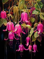 Dew Kissed Mystery - Dit fuchsia schilderij onthult een levendige verzameling van roze fuchsia bloemen, badend in zachte ochtenddauw en omgeven door rijke groene bladeren, waardoor een sfeer van rustige schoonheid ontstaat.