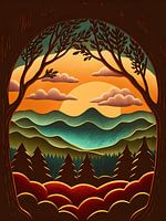Deze afbeelding heeft een gestileerd, illustratief landschap in warme, aardse tinten. Het ontwerp doet denken aan een vintage reisposter met een vleugje volkskunst. Het toont een serene zonsondergang omlijst door een boog van silhouetten van bomen.