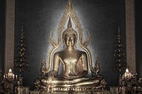 De gouden figuur van Phra Buddha Chinnarat rijst voor me op - een beeld van perfecte gratie, ingebed in een licht dat niet van deze wereld lijkt te komen. Het beeld lijkt niet alleen omhuld te zijn door licht, maar er ook de bron van te zijn - alsof de zon haar straling in dit beeld van de ontwaakte heeft gegoten. Zijn gouden gloed staat in fascinerend contrast met de diepe, donkerblauwe muur die erachter oprijst als een stille nachtelijke hemel vol onuitgesproken wijsheid.