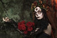 Portret van een jonge vrouw met zogenaamde 'Sugar Skull' make-up bekend van het Mexicaanse traditionele 'Dia de los Muertos' (Dag van de doden). In haar armen heeft ze een bos rode rozen.