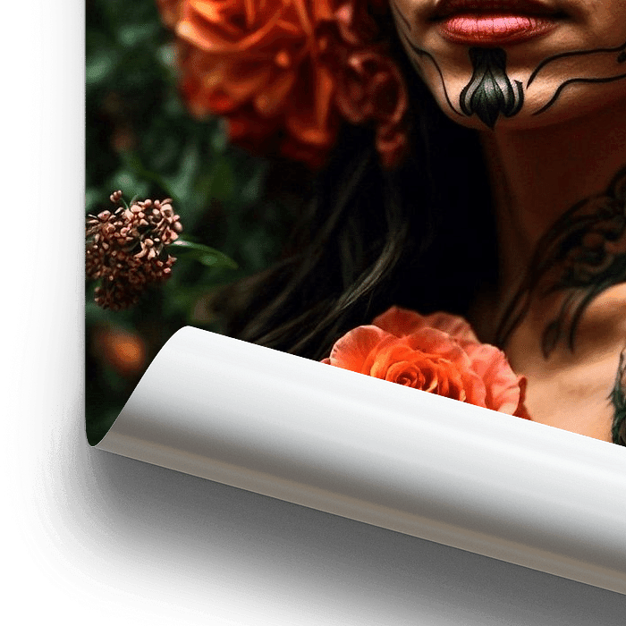 Onze fine art print legt de tijdloze schoonheid en culturele diepgang van Día de Muertos op indrukwekkende wijze vast. Het motief toont een vrouw met gesloten ogen, kunstig opgemaakt in de stijl van Día de Muertos. Ze wordt omringd door levendige licht- en donkeroranje rozen, die een aura van elegantie en herinnering creëren.