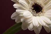 "Diagonaal: Witte Gerbera met bordeauxrode achtergrond" is een macrofoto van een witte (crèmekleurige) Gerbera (Asteraceae).