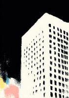Dit abstracte schilderij toont een witte gevel van een gebouw vanuit het perspectief van een kikker, diagonaal van linksonder naar rechtsboven. Gelijkmatig verdeelde, donkere ramen vormen een geometrisch raster dat de hoogte en structuur van het gebouw benadrukt. De zwarte achtergrond zorgt voor een sterk contrast en benadrukt de…