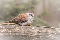 Prachtige close-up foto van een sierlijke diamantduif. De vogel zit op een boomstronk en is mooi scherp vastgelegd. De bruine veren met witte stippen en de rode cirkel om het oog geven een mooi kleurenpalet. De achtergrond is zacht en wazig.