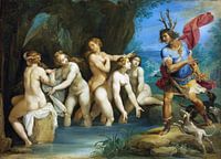 Terwijl de vrouw zich naakt wast met andere vrouwen komt de man en verrast de naakte dames. Doordat de meiden bloot op het portret staan zijn benen, billen, heupen, ruggen, buiken, torso's en borsten op het naaktportret gezet. De man, de jager met zijn jachthonden lijkt de dames te waarschuwen.