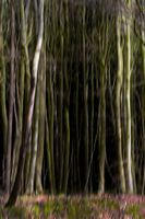 Dicht abstract wazig bos, lange boomstammen en bloemen op de grond, kunstnatuur achtergrond, kopieerruimte, verticaal