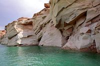 Dicht bij de wand komen terwijl je door het water vaart op Lake Powell bij de stad Page in Arizona, VS. Die rotsen zijn immens. Het meest verbazingwekkende vonden we dat ze niet zo glad waren als de meeste andere rotsen na duizenden jaren erosie.