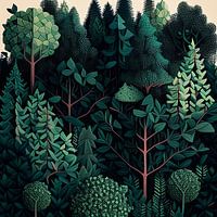 Een levendige en gedetailleerde vectorillustratie van een dicht bos met een grote verscheidenheid aan bomen en planten. Het kunstwerk maakt gebruik van diepgroen voor het gebladerte en zachtroze en geel voor de bloemen, waardoor een natuurlijke, levendige scène ontstaat. De afbeelding heeft een hoge resolutie en is full colour met een…