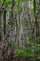Dichtbegroeid sprookjesbos met groen mos op de boomstammen - berkenboom met groen mos en bladeren met zonlicht van boven