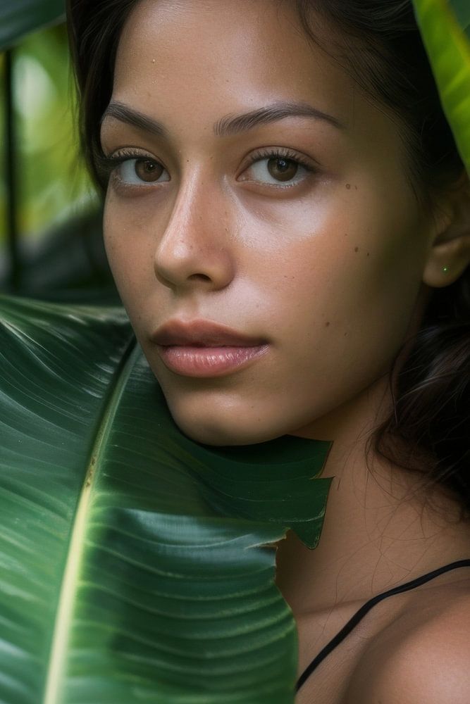 De foto toont een jonge vrouw die zachtjes verscholen ligt tussen weelderige groene bladeren. Haar stralende teint en de veranderingen in het licht creëren een levendige, natuurlijke uitstraling. De combinatie van de zachte rondingen van haar gezicht en de dichte plantenwereld geeft een gevoel van intimiteit en harmonie met de natuur.