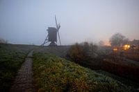 Deze mysterieuze ochtend in Heusden wordt gehuld in een dikke mist die het zicht beperkt. De lucht is zacht oranje gekleurd door de lichtjes van de huizen in de verte. De molen op de achtergrond staat er als een sentinel, stoïcijns in de stilte. Het wandelpad leidt je verder in de mist. Het is een rustgevend tafereel, waar je je afgezonderd voelt van de rest van de wereld. Het is een moment van stilte, waarin de tijd stil lijkt te staan. De lucht is zwaar en de stilte wordt alleen onderbroken door het kabbelen van de beek en het geruis van de wind. Een magisch moment om te koesteren.