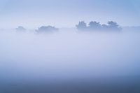 Dichte mist op de Veluwe. De boomtoppen steken net boven de mist uit.