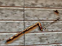 Fotokunst van n oude houten deur, gesloten en vergrendeld met een diagonale bout. Beveiliging oude stijl!