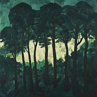 Een donker bos met hoge bomen die als silhouetten oprijzen tegen een lichtere achtergrond. De takken en bladeren vormen een dichte kruin, terwijl de schaduwen op de grond een mysterieuze sfeer creëren. De grove penseelstreken en subtiele kleurverlopen geven het kunstwerk een dromerig, bijna impressionistisch karakter. Het contrast…