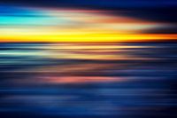 Een levendige zonsondergang weerspiegelt over wazig water waarin kleuren geel, oranje en blauw samensmelten in horizontale strepen. De afbeelding geeft een gevoel van beweging en rust door de abstracte weergave van een zeegezicht.