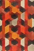Warme tinten van rood, oranje en oker vormen samen een ritmisch patroon van overlappende blokken. De herhaling creëert een spel van diepte en beweging – alsof het beeld langzaam verschuift terwijl je ernaar kijkt. De balans tussen lichte en donkere vlakken geeft het geheel een krachtige maar ingetogen uitstraling, perfect om een ruimte warmte en karakter te geven.