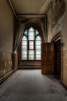 Glas in lood in een vervallen en verlaten klooster. deze foto geeft diepte door de gang met aan het eind het raampartij en de open deur. heerlijke rustige kleuren. Urban exploring (urbex).