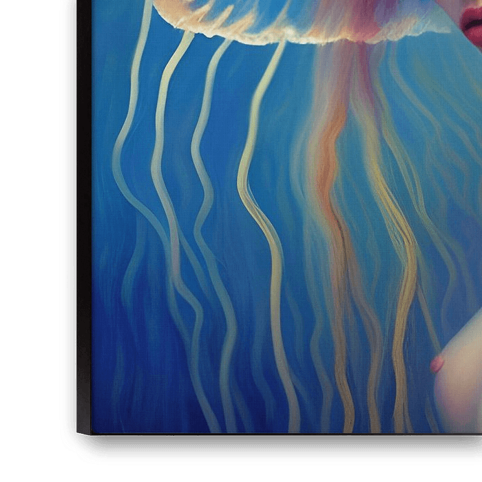 Het kunstwerk "Diepzeeschoonheid" vangt de verbeelding en verwondering van een buitengewoon onderwater tafereel. In het hart van deze betoverende compositie staat een gracieuze vrouw, haar gestalte omhuld door het sierlijke silhouet van een kwal die sierlijk op haar hoofd rust.