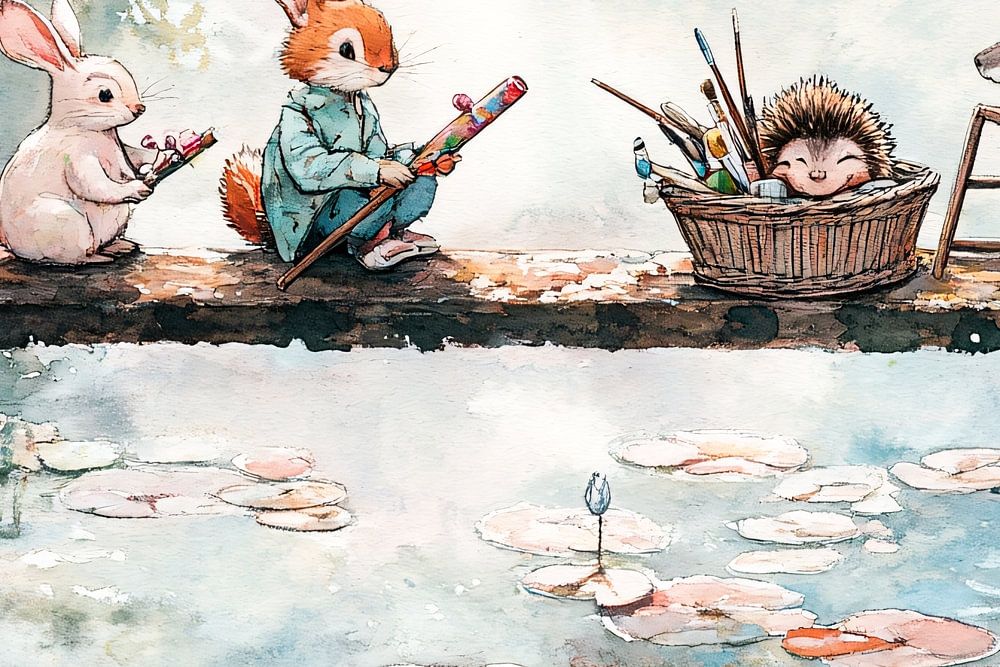 Een betoverend ontwerp waarin bosdieren samenkomen op een houten brug boven een serene vijver vol waterlelies. Het zachte kleurenpalet van aquarel brengt een rustieke charme en een magisch gevoel. Dit prachtige tafereel is perfect voor liefhebbers van natuur en dieren. Ideaal als muurdecoratie voor een slaapkamer of hobbykamer.