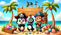 Deze kleurrijke foto neemt ons mee naar een vrolijk pirateneiland waar een vrolijke aap en twee schattige pinguïns verkleed als piraten een schat hebben ontdekt. De aap, met een grote glimlach en een piratenhoed, leunt zelfverzekerd tegen een kist vol glimmende schelpen en zeesterren. Een van de pinguïns, ook met piratenhoed, staat…