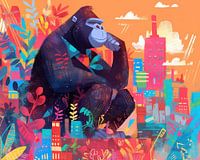 Dierenschilderij - Dit abstracte dierenschilderij toont een denkende gorilla zittend tussen kleurrijke, gestileerde stads- en natuurtaferelen, waarbij de oranje achtergrond en blauwe elementen domineren.