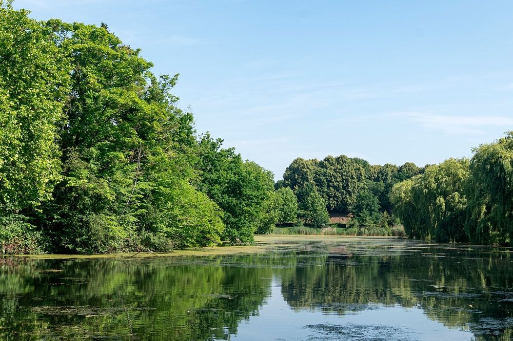 Diest Flemish Brabant Belgium Trees in their summer foliage reflected in canals which were built in the 1830’s as a defensive moat. summer, scene, Vlaams Brabant, landscape, verdedigingslinie,