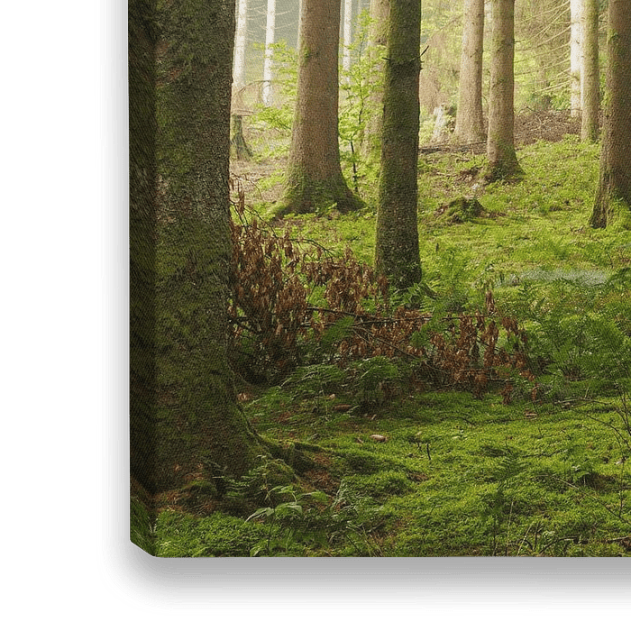 Wanneer je bij een wandeling s'ochtends vroeg door de Ardense bossen wandelt dan wordt het opkomende zonlicht mooi diffuus gespreid door de ochtendmist. Bij deze foto komt het zonlicht zijdelings tussen de boomstammen en zorgt voor een sfeerrijke belichting van het dennenbos. Het bos ligt langs de rivier de Semois.