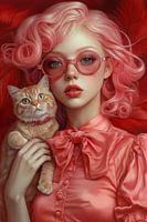 Een betoverend digitaal kunstwerk dat vintage en moderne elementen naadloos vermengt. De compositie toont een etherische verschijning in een koraalroze blouse met strikdetail, gedrapeerd in weelderig roze krullend haar. De transparante rode bril en de gemberkleurige kat met felgroene ogen creëren een harmonieus kleurenspel tegen de warme rode achtergrond, wat resulteert in een nostalgisch maar eigentijds portret.