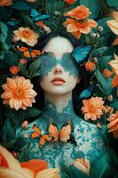 Een betoverend surrealistisch portret waarin turquoise kantwerk versmelt met perzikkleurige dahlia's en dynamische vlinders. De compositie toont een harmonieus samenspel tussen delicate blauwe Morpho-vlinders en oranje monarchvlinders die dansen tussen weelderige bloemen, terwijl een mysterieus kanten masker het gezicht siert in een dromerige sfeer van romantiek en natuurlijke magie.