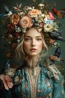 Een betoverend digitaal kunstwerk waarin klassieke schoonheid wordt vermengd met moderne digitale technieken. Een etherisch portret getooid met een weelderige bloemenkrans, omringd door kleurrijke vogels in vlucht. De turquoise jurk met vintage details en delicate kant vormt een perfect contrast met de zachte, romantische bloementinten van roze, perzik en crème. Het geheel straalt een tijdloze elegantie uit die klassieke schilderkunst verbindt met hedendaagse digitale expressie.