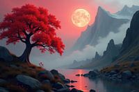 Een digitaal schilderij toont een levendige rode boom op een rotsachtige oever naast een rustig meer bij zonsondergang, met een grote volle maan en mistige bergen op de achtergrond.