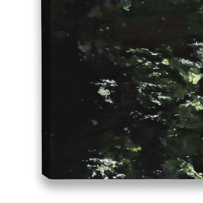Een digitaal schilderij van een bos met groene bladeren op de bomen met schitterend zonlicht van boven.