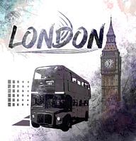 Eine moderne und dekorative Fotomontage belibter Motive aus London. Mitten in Westminster ist hier der Big Ben und eines der typischen roten Busse zu sehen. Viele weitere grafische und abstrakte Details machen die typische Szene zu etwas Einzigartigem.