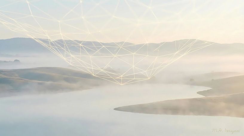 Ervaar de serene overgang van nacht naar dag met 'Digital Dawn'. Dit werk uit de Ethereal & Digital collectie vangt een verstild, mistig landschap bij zonsopgang, waar de natuurlijke wereld subtiel wordt doorkruist door een zwevend goudkleurig grid.