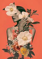 Digital art collage "Bloom like a flower", contemporary art. Een bijzondere blikvanger voor je interieur! Een collage van een portret gecombineerd met bloemen tegen een oranje achtergrond.
