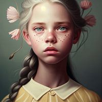 Digital art portret "meisje met bloemen". Portret van een blond meisje met lang haar in een vlecht, gele kleding en roze bloemen in het haar. Sproetjes op het gezicht.