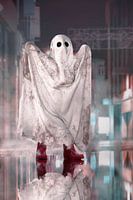 Deze digitale bewerking toont een kind verkleed als spook, geplaatst in een nachtelijke scène vol met waterdamp en reflecties, zorgvuldig gekozen om een sfeer van mysterie en spanning te creëren. De keuze voor de nacht als achtergrond benadrukt het bovennatuurlijke thema en versterkt het gevoel van duisternis en verborgenheid. De…