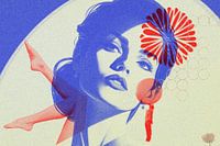 Het werk is een ode aan de iconische Pop Art stijl, uitgevoerd als een digitale zeefdruk. Met een palet van krachtige rood- en blauwtinten en gedurfde grafische elementen wordt de essentie van retrokunst op eigentijdse wijze opnieuw uitgevonden. De compositie combineert een elegante vrouwelijke vorm met speelse patronen, waaronder florale accenten en geometrische figuren. De textuur en korrelige afwerking roepen de sfeer op van traditionele zeefdrukkunst, maar met een moderne, digitale twist.