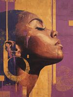 Een krachtig vrouwenportret vormt het middelpunt van deze moderne mixed-media compositie. De vrouw is in profiel te zien, haar blik naar boven gericht, wat de foto een hoopvolle, optimistische uitstraling geeft. De kunstenaar heeft het gezicht met indrukwekkende aandacht voor detail geschilderd - van de fijne gelaatstrekken tot de natuurlijke schaduw van de huid.
