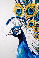 Dit prachtige digitale ontwerp van een pauw straalt elegantie en levendigheid uit. De felle blauwe en gele kleuren zorgen voor een dynamisch contrast dat meteen in het oog springt. Het ontwerp combineert moderne kunst met natuurlijke schoonheid en brengt de majestueuze pauw op een unieke manier tot leven. De gedetailleerde weergave van de pauwenveren, met hun iconische ronde oogpatronen, vormt een harmonieus geheel met de rest van het ontwerp. Dit kunstwerk zou perfect passen in een moderne slaapkamer of kantoorruimte waar het als een echt statement piece kan dienen. Met zijn krachtige kleuren en opvallende details trekt het de aandacht en creëert het een energieke sfeer in elke ruimte.