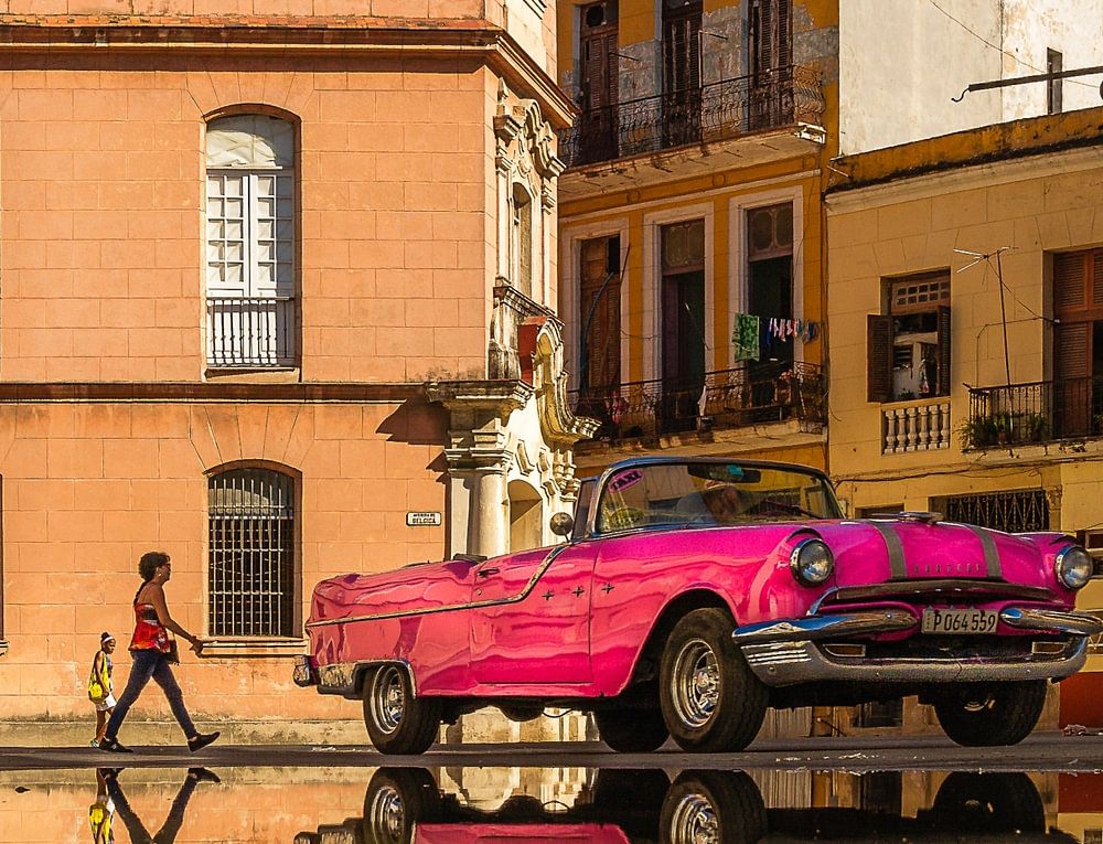 Pontiac oldtimer weerspiegeld in een plas water in een straat in Havana Cuba.